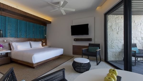 Experience refined comfort in this 409-square-foot room featuring a plush king bed and a private furnished balcony. Floor-to-ceiling windows invite natural light and offer views of the resort’s tranquil gardens. Modern amenities and thoughtful design elements create a serene retreat for relaxation and connection.